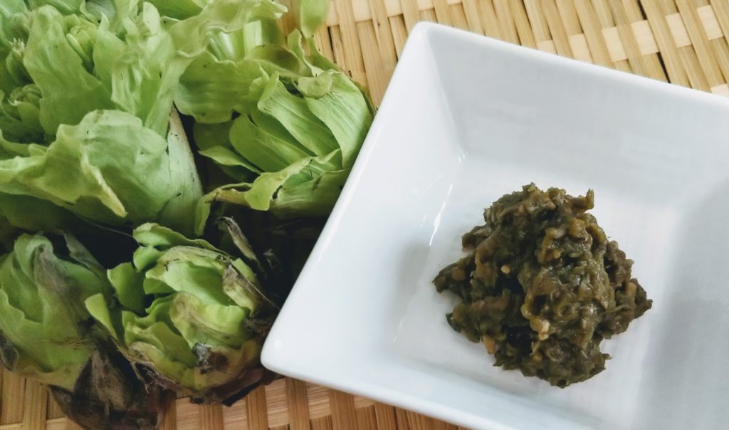刻んだふきのとうをごま油で炒めて、味噌、砂糖、みりん、酒などで味付けした「ばっけみそ」を作りましたよ。